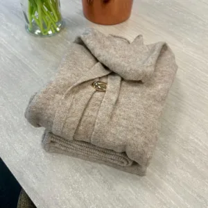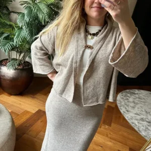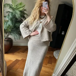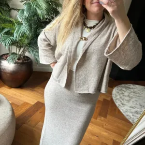 Laat de koude maanden maar komen met deze prachtige dames set, bestaande uit een zachte cardigan en een stijlvolle lange rok met elegante goudkleurige gesp. Deze set is niet alleen een lust voor het oog, maar ook heerlijk warm én hij prikt absoluut niet. Perfect voor wie comfort en klasse wil combineren tijdens de winterdagen.