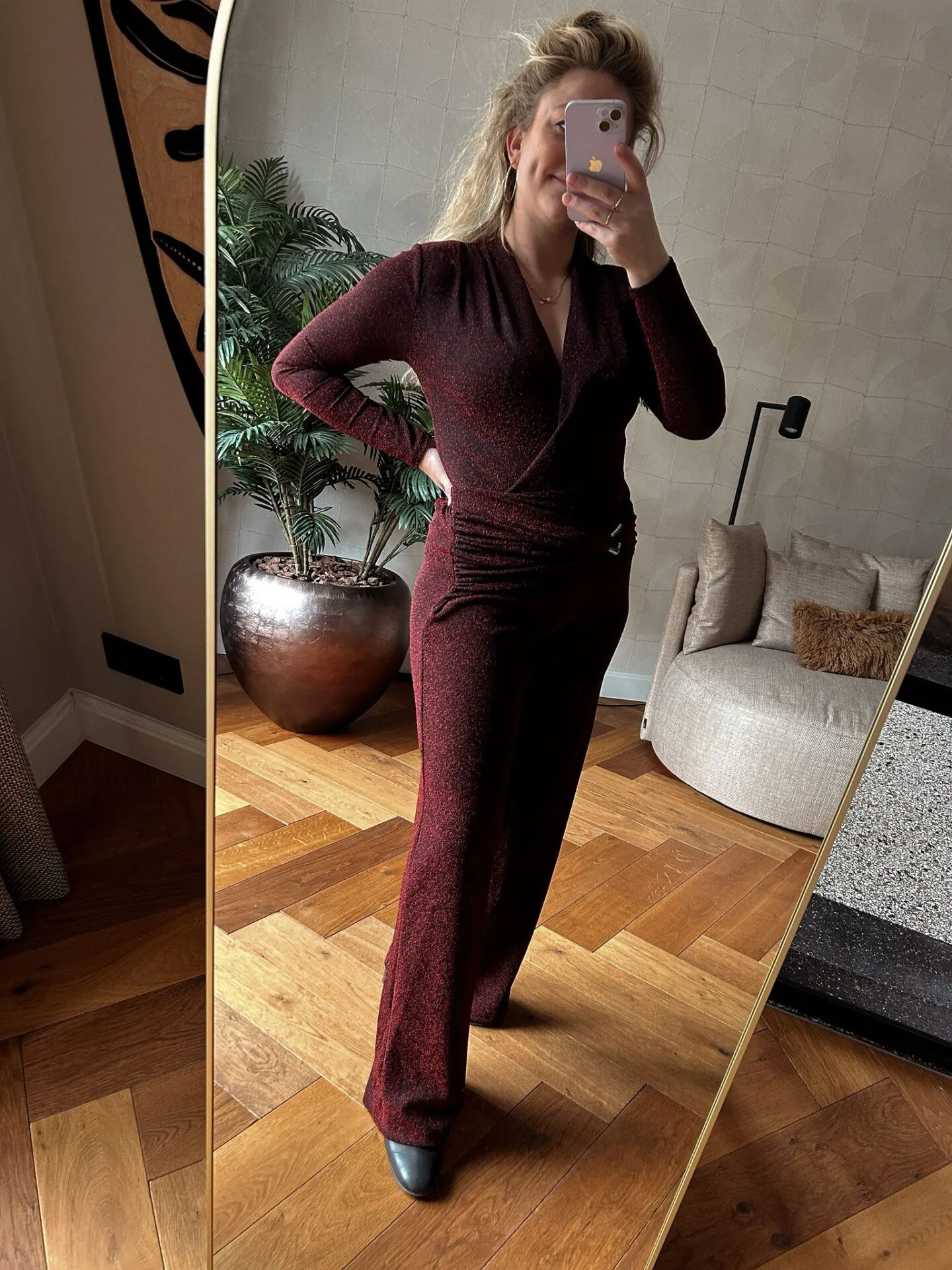 Deze prachtige tweedelige set bestaande uit een elegante body en perfect aangesloten broek is ontworpen om je tijdens de koude herfst- en winterdagen zowel stijlvol als comfortabel te laten voelen. De rijke bourgundy kleur geeft de set een luxe en feestelijke uitstraling, ideaal voor de feestdagen of een chique avondje uit.