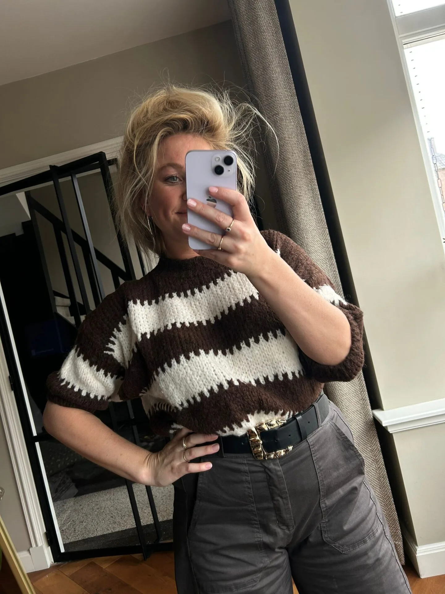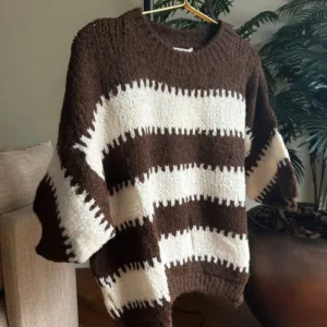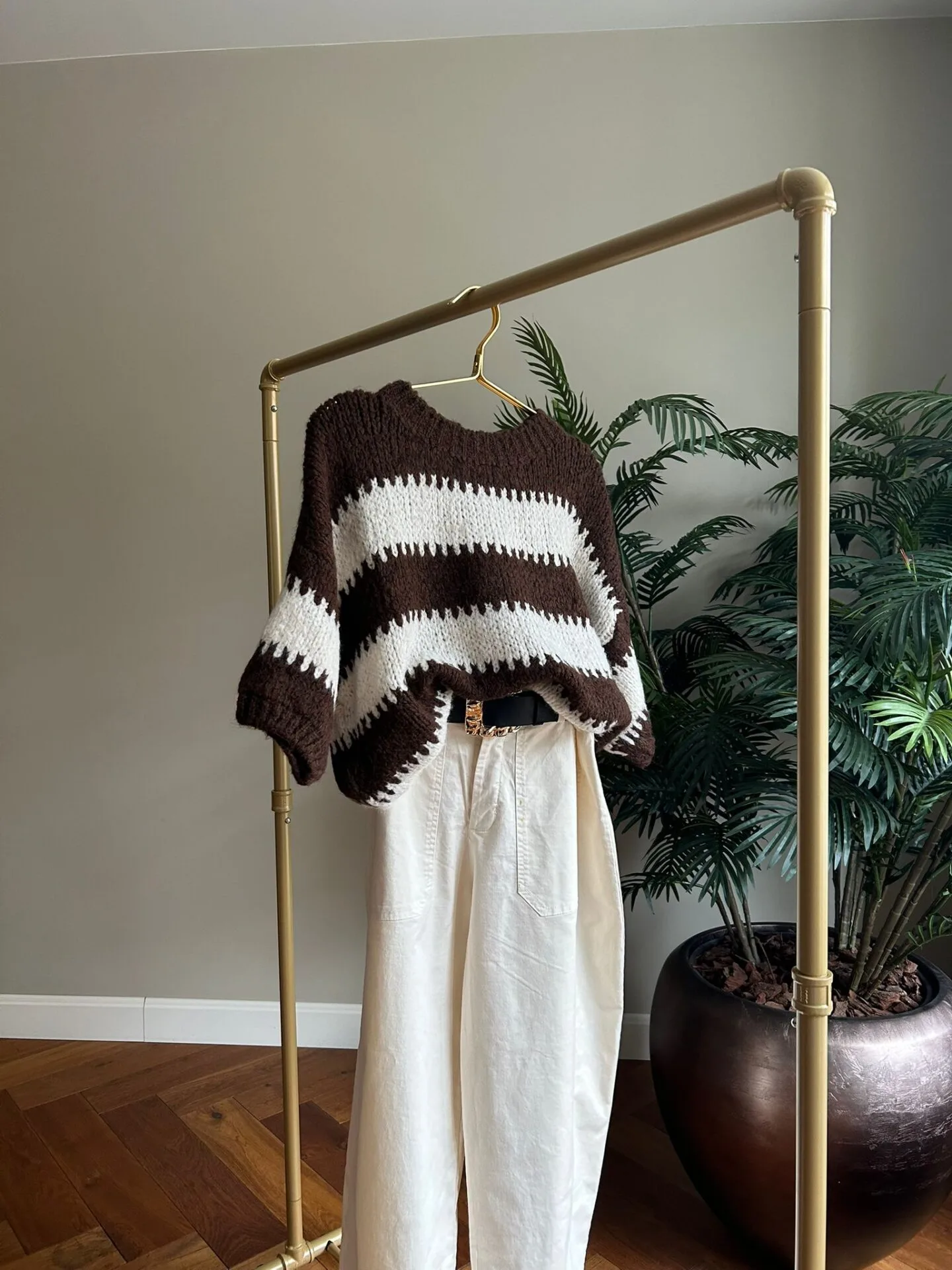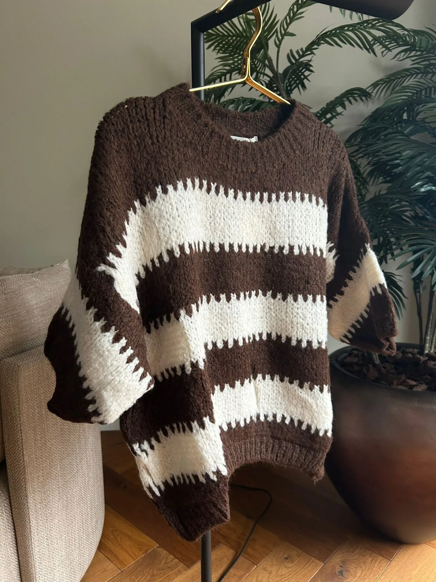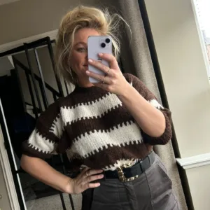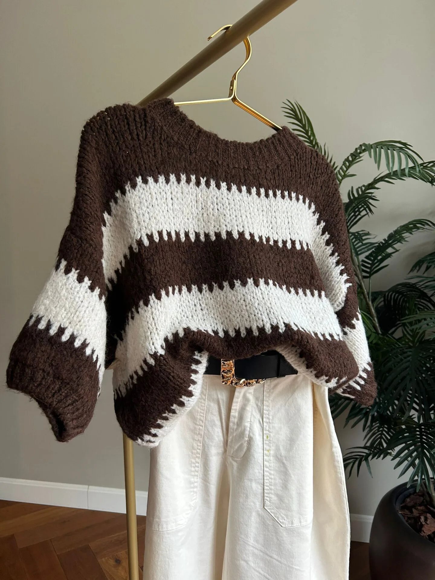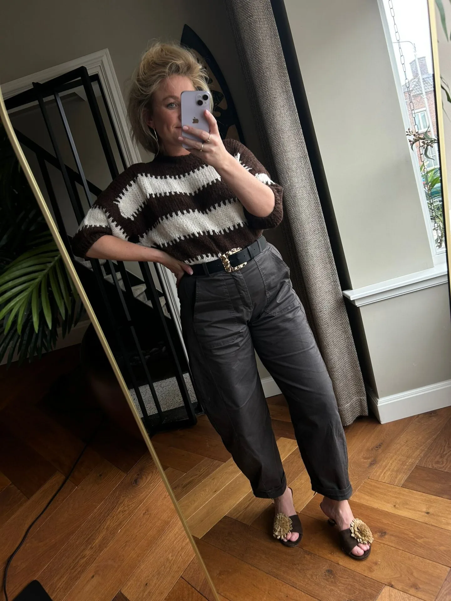 Stijlvolle en comfortabele trui met een tijdloze streep en ronde hals. De mouwen vallen tot net over de elleboog (3/4 lengte) en de totale lengte van de trui is 60cm.