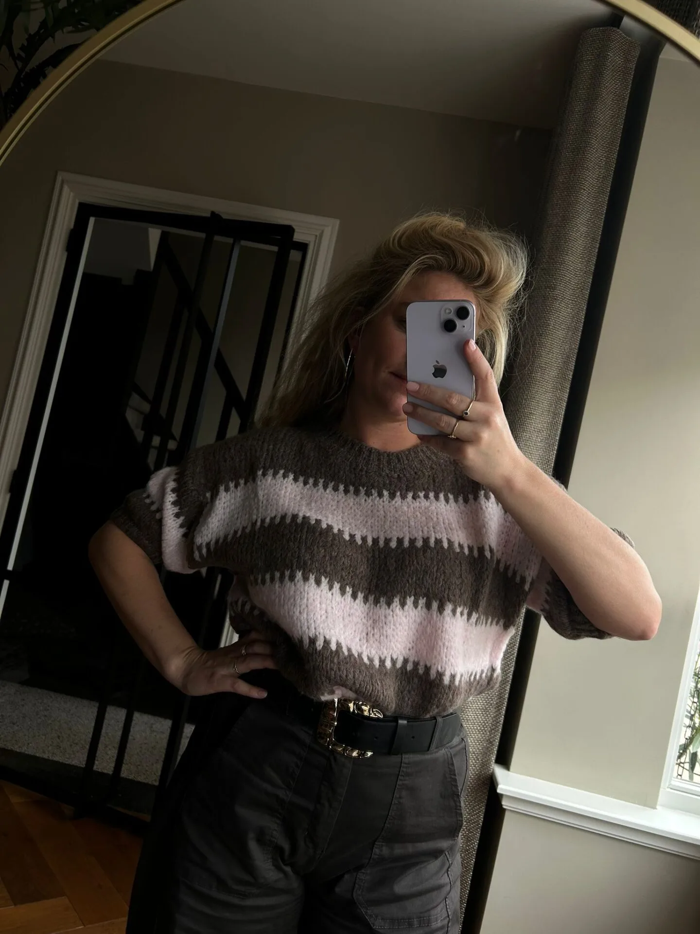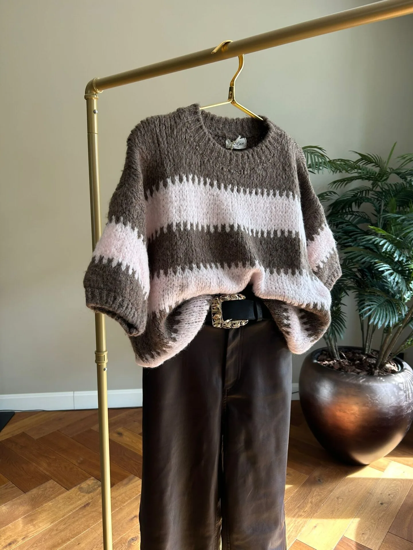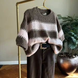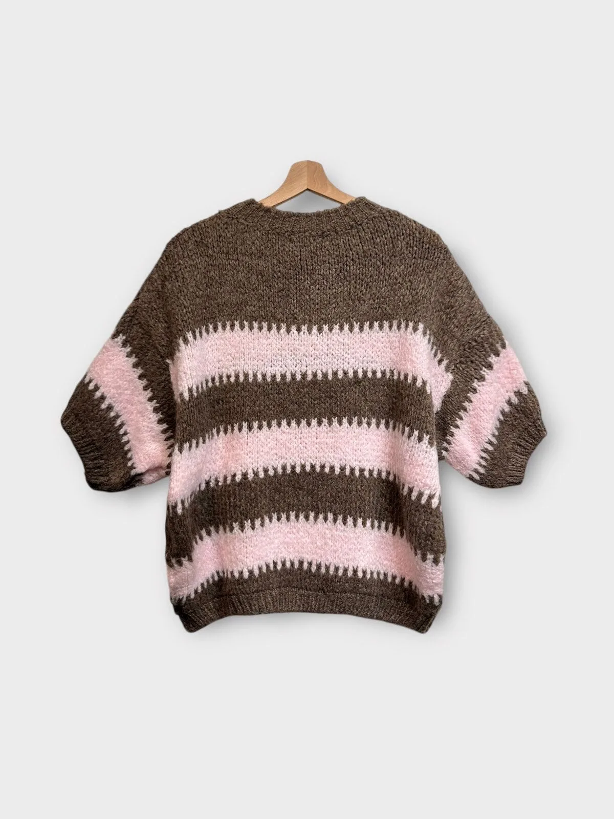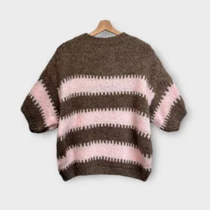Stijlvolle en comfortabele trui met een tijdloze streep en ronde hals. De mouwen vallen tot net over de elleboog (3/4 lengte) en de totale lengte van de trui is 60cm.