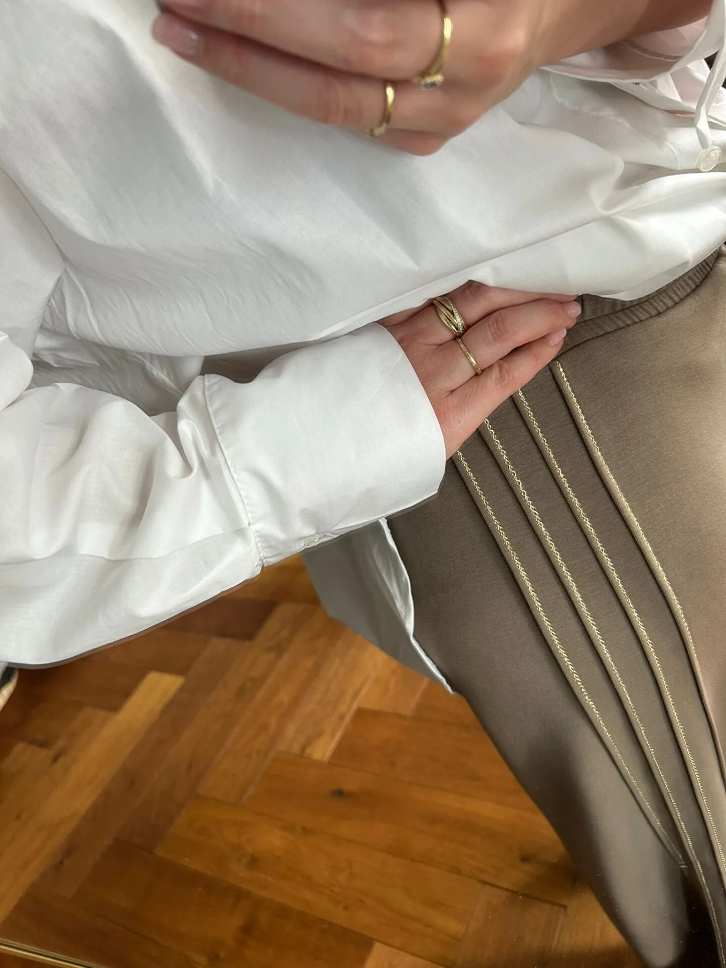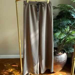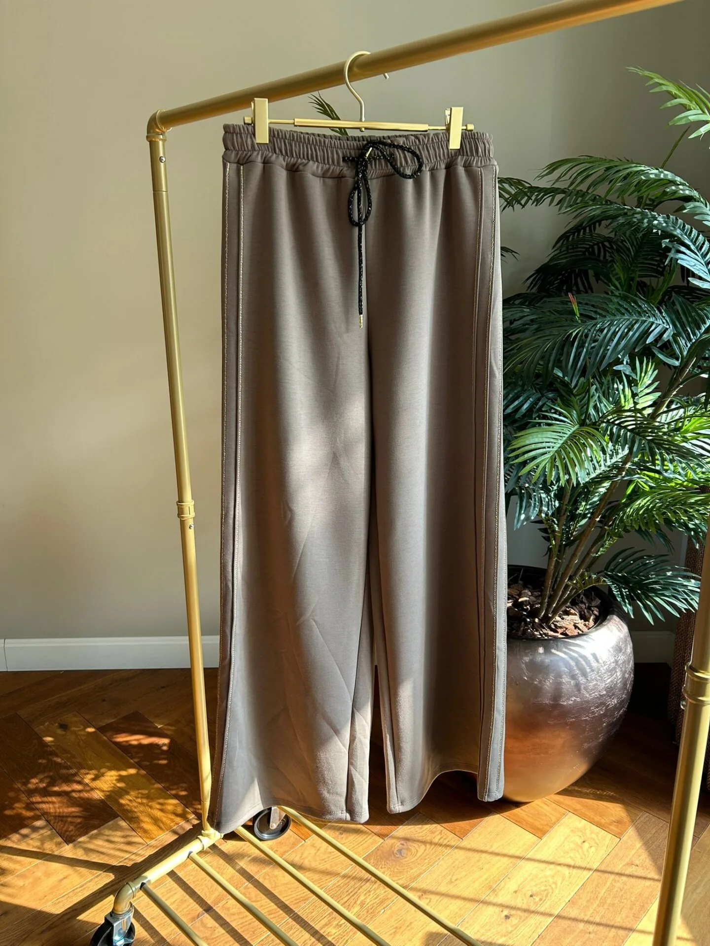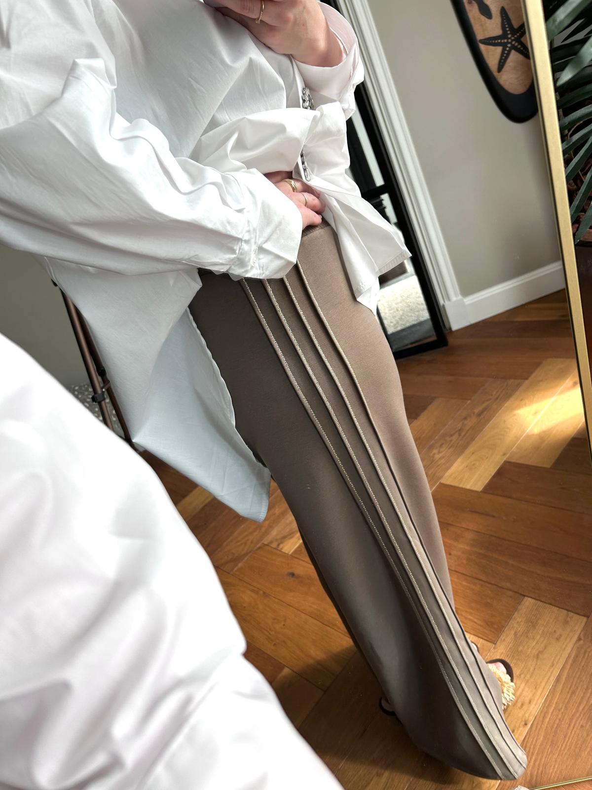 Comfort en elegantie in één! Deze soepel vallende broek met elastische taille en gouden strepen aan de zijkanten is perfect voor elke gelegenheid. Flatteert maat 34 tot 40 voor een stijlvolle look. Tekent niet af!